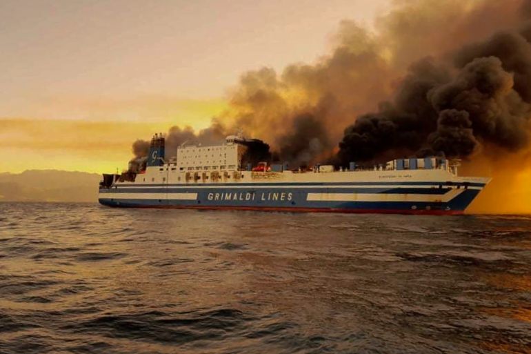 Television images showed the ship, owned by Italy’s Grimaldi Lines, enveloped in flames that sent plumes of black smoke into the sky.