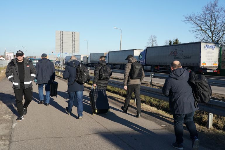 Ukrainiand make their way back to their homes at the Dorohusk border crossing between Poland and Ukraine [Janek Skarzyncki/AFP]