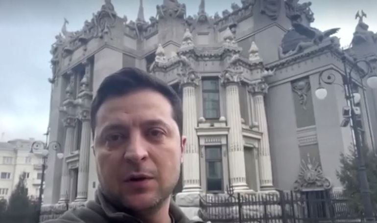 Ukrainian President Volodymyr Zelenskyy has appeared in a video filmed outside his office in Kyiv, pledging to fight as Russia’s invading forces stormed towards the capital.