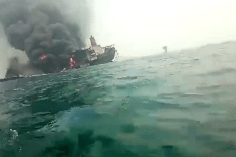 Images published by local media showed thick black smoke billowing from a sinking ship engulfed by flames.
