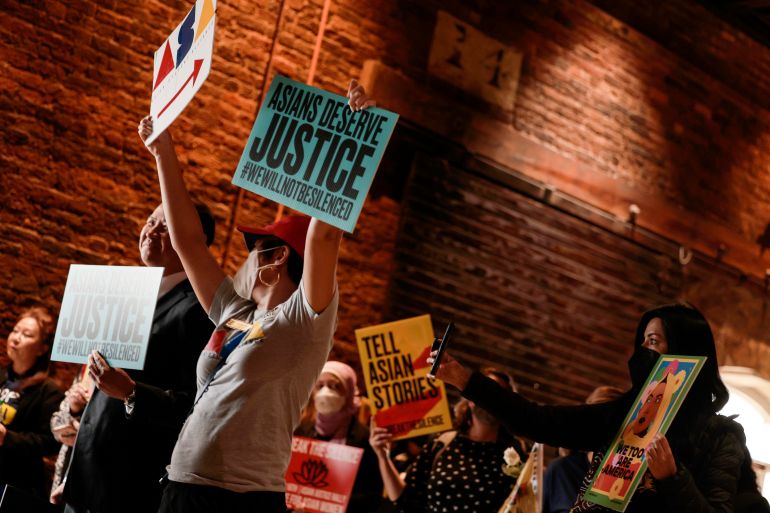 In Atlanta on Wednesday, about 200 people assembled inside a freight depot, some holding signs with the slogans such as “We will not be silent” and “Asians deserve justice”.