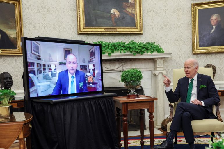 Irish prime minister’s one-on-one meeting with President Joe Biden was held by video after a positive test for COVID-19.