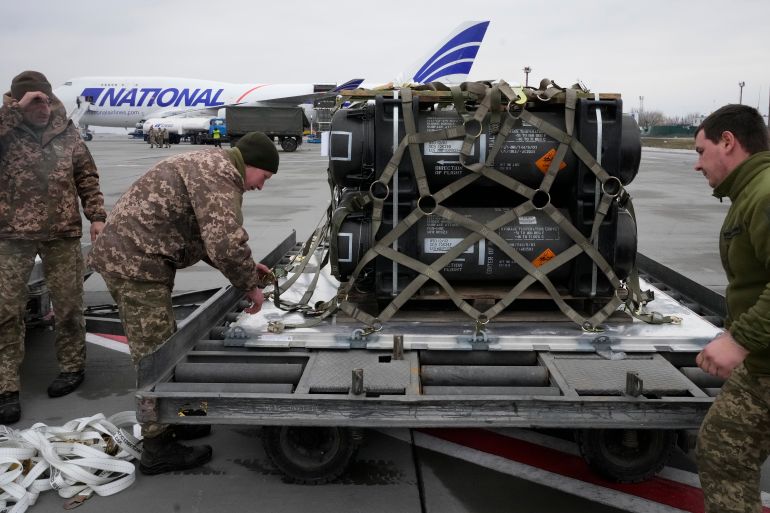 ![Ukrainian servicemen unpack shipment of military aid delivered as part of the US' security assistance to Ukraine, at the Boryspil airport, outside Kyiv [File: Efrem Lukatsky/AP]](https://www.aljazeera.com/wp-content/uploads/2022/04/AP22042371875277.jpg?resize=770%2C513&quality=80)