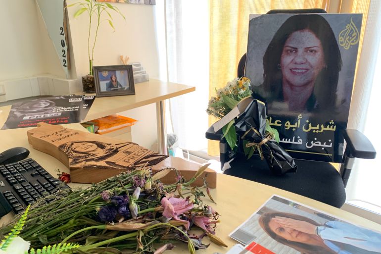 At the Global News Insight bureau, her photos are everywhere. Abu Akleh’s office, now a little memorial, is filled with flowers, candles, and farewell notes, commemorating her long career and the legacy she left behind.