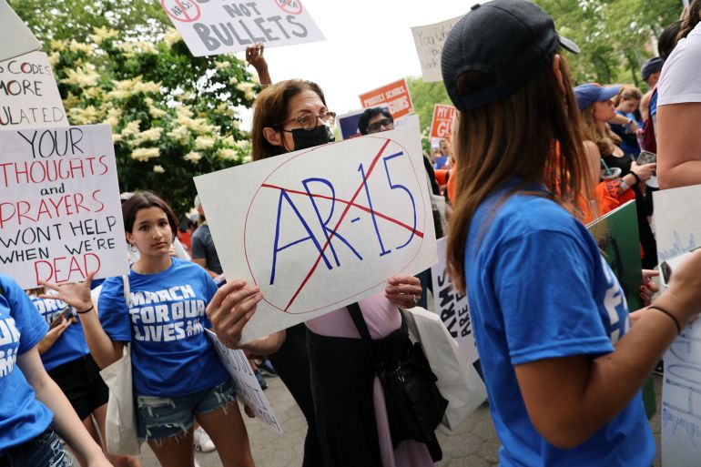 ![People prepare to march across the Brooklyn Bridge in New York to protest against gun violence in the March for Our Lives rally on Saturday June 11, 2022 [Spencer Platt/Getty Images/via AFP]](https://www.aljazeera.com/wp-content/uploads/2022/06/063_1402337707.jpg?resize=770%2C513&quality=80)