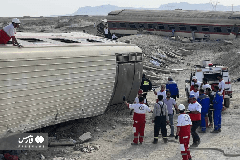 The derailment happened some 50km (30 miles) outside of Tabas on the rail line that links the city to the central city of Yazd. Photos from the scene, published by the Young Journalists Club associated with state TV, appeared to show train carriages on their side as rescuers tried to care for the injured.