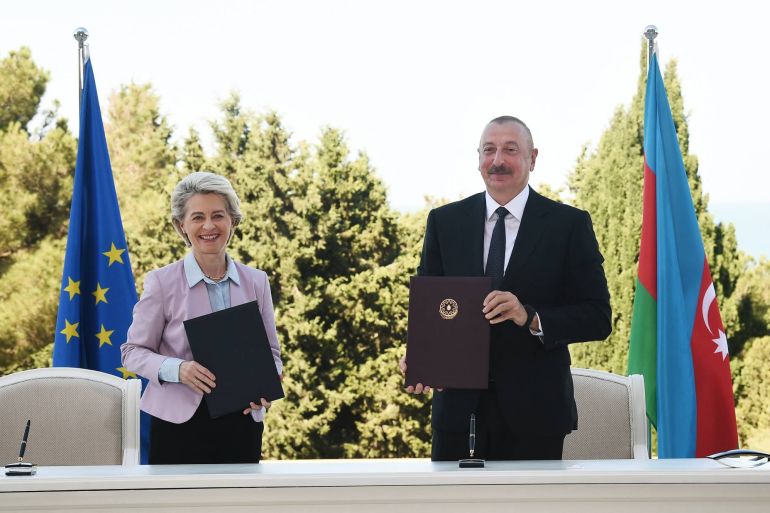 She said the European Union is seeking to double gas imports from Azerbaijan as it seeks non-Russian suppliers after Moscow’s invasion of Ukraine.