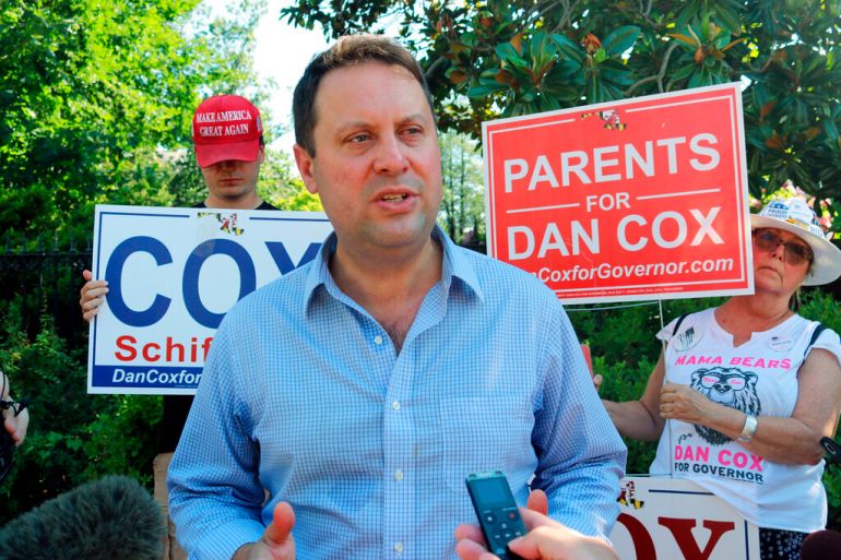 It is also a setback for Hogan’s brand of traditional conservatism. The Maryland governor previously called Cox a “Q-Anon conspiracy theorist who says crazy things every day”.