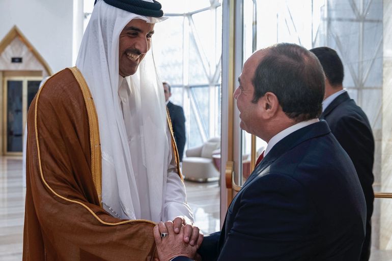 El-Sisi met Qatari Emir Sheikh Tamim bin Hamad Al Thani at the airport on Tuesday on the first day of the two-day visit as the two countries aim to boost ties.