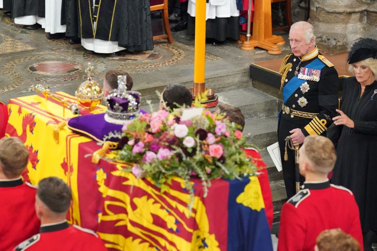 The oak coffin was covered with the Royal Standard flag, the queen’s colours, with the Imperial State Crown on top, placed on a gun carriage and pulled by naval personnel to Westminster Abbey, where Queen Elizabeth was married in 1947 and crowned queen in 1953.