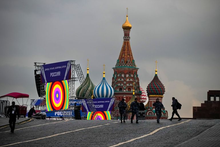 Kremlin spokesperson Dmitry Peskov has told reporters that Putin will deliver a major speech on Friday, but did not say whether the president would attend a concert being held on the square, where giant video screens have been set up, and billboards proclaim the names of the regions: ‘Donetsk, Luhansk, Zaporizhia, Kherson – Russia!’.