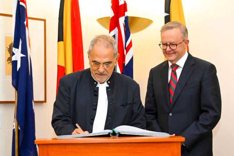 ![East Timorese President Jose Ramos-Horta, left, signs the visitors book as Australian Prime Minister Anthony Albanese watches in Canberra, Australia, on Wednesday, September 7, 2022 [Lukas Coch/AAP/ via AP]](https://www.aljazeera.com/wp-content/uploads/2022/09/AP22250059733400.jpg?resize=770%2C513&quality=80)