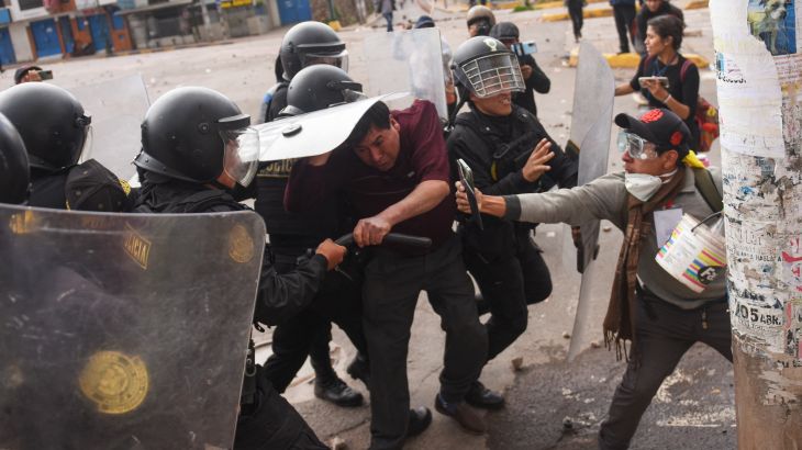 ![Protesters clash with members of the Peruvian riot police in the city of Cusco, Peru on January 11, 2023 [Ivan Flores/AFP]](https://www.aljazeera.com/wp-content/uploads/2023/01/000_336W3U9.jpg?resize=730%2C410&quality=80)