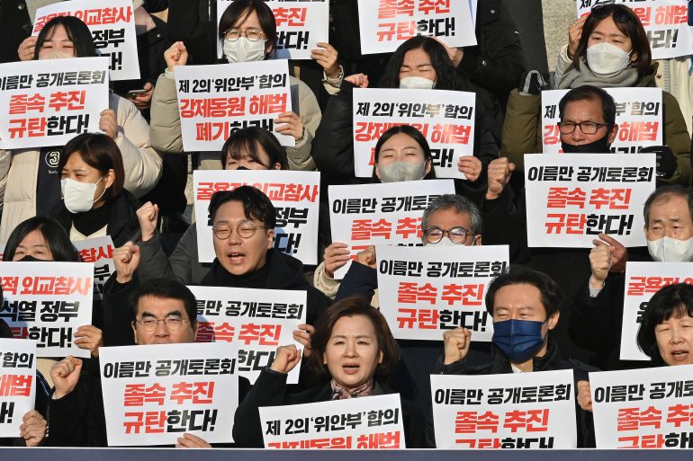 A group of activists meanwhile staged a rally outside the National Assembly on Thursday, where the hearing was held, criticising the South Korean government’s proposal as well as Japan’s refusal to pay compensation.