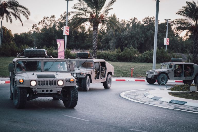 A steady flow of buses and passenger cars filled with military personnel are moving towards Israel’s border with Gaza.