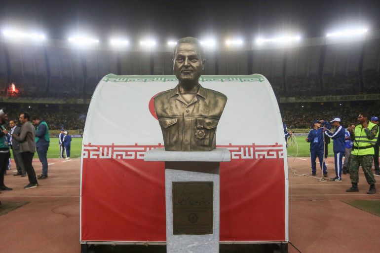 Photographs on social media showed a bust of Soleimani placed at the entrance of the football pitch, prominently displayed before players who would have exited the tunnel onto the field.