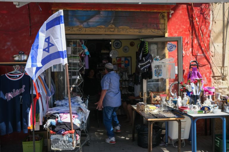 Israeli flags stand draped across stalls filled with bric-a-brac. “People are here from all over the world”, he said, motioning the globe with his hands.