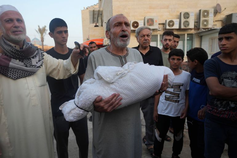 ![Palestinians mourn relatives killed in the Israeli bombardment in Al-Aqsa Hospital in Deir Al-Balah, south of the Gaza Strip, Monday, Oct. 23, 2023 [Ali Mohmoud/AP Photo]](https://www.aljazeera.com/wp-content/uploads/2023/10/AP23296466324808-1698084450.jpg?w=770&resize=770%2C513&quality=80)