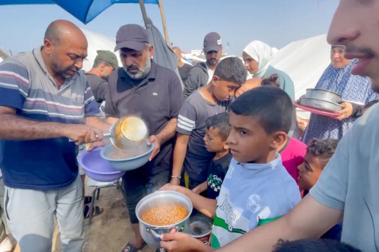 In one of the areas set up for displaced Palestinian families in Khan Younis, volunteer cooks aim to feed 500 people daily.