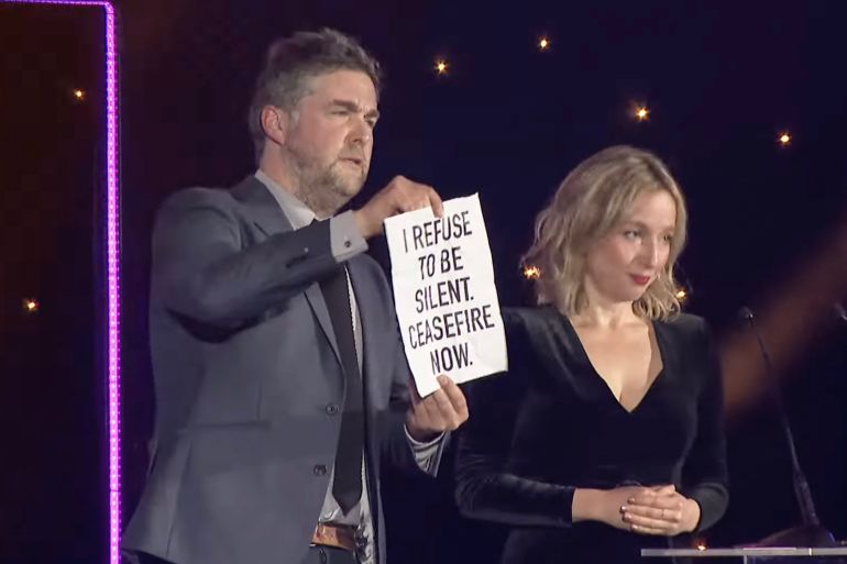 She used her acceptance speech to call on guests to “use your voice as filmmakers and artists” to lobby for a halt to Israel’s bombardment of Gaza, as her colleague Finlay Pretsell displayed a poster that read, “I refuse to be silent. Ceasefire now.”