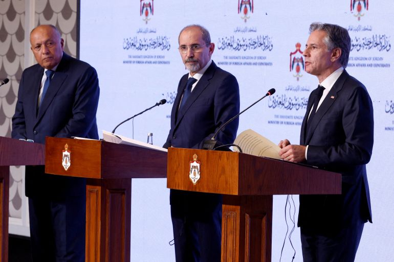 Blinken held a news conference in Jordan’s capital, Amman, on Saturday alongside Jordan’s Deputy Prime Minister Ayman Safadi and Egypt’s Foreign Minister Sameh Shoukry, during his third visit to the region since the war began.