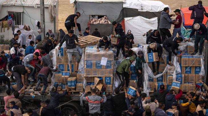 Dozens of Palestinians surrounded the aid trucks after they drove in through the Rafah crossing with Egypt, forcing some to stop before climbing aboard, pulling food and water boxes down, and carrying them off or passing them off to crowds below.