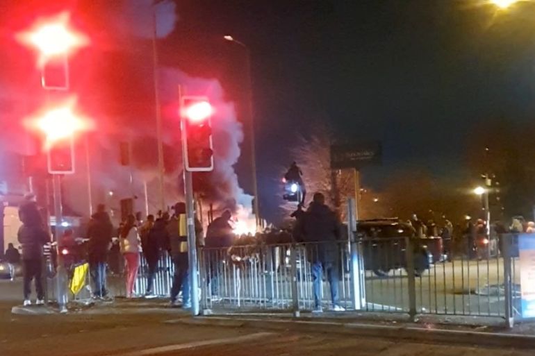 The police force said some protesters threw objects and set a police van on fire. The people arrested, who ranged in age from 13 to 54, were detained “following violent disorder.”