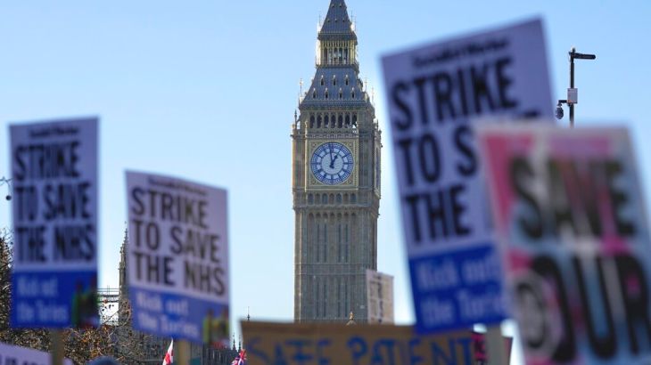 Thousands of protesters marched through London to the British prime minister’s residence on Saturday to support healthcare workers who have held a series of strikes over pay and conditions in the state-funded National Health Service.