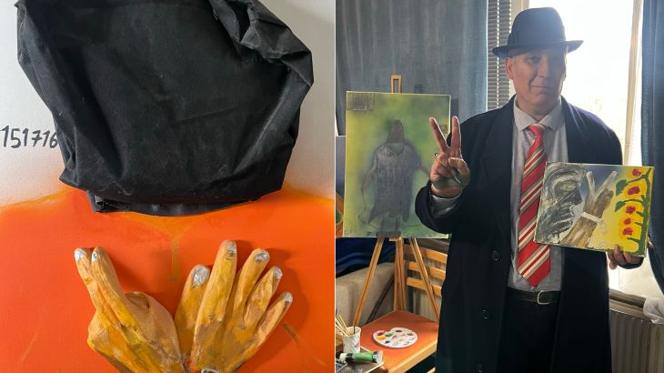 Despite his hand losing complete function because of the torture, Ali likes to paint in his spare time. His apartment is full of canvases. One stands out – a hood, orange jumpsuit, and handcuffs with 151716 painted on it, Ali’s prisoner number. He says they wrote “Big Fish” with a marker on his forehead, a common practice of “marking” high-profile prisoners.