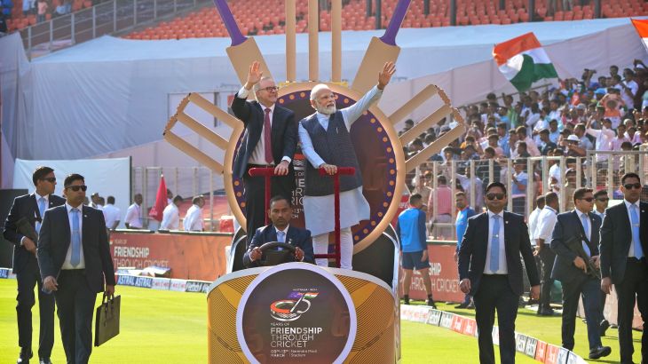Anthony Albanese and Narendra Modi inaugurate cricket match between their teams at Ahmedabad stadium named after the Indian PM.