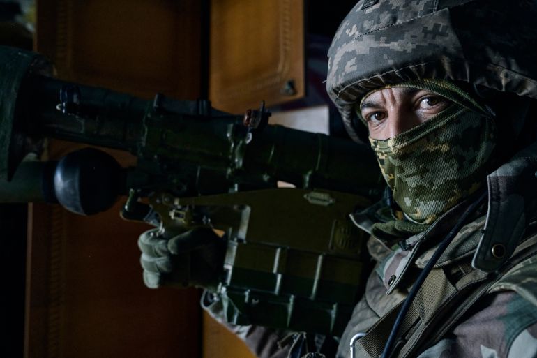 ![A Ukrainian soldier looks at the camera while holding a rocket launcher in Bakhmut, in the Donetsk region, Ukraine, Wednesday, April 26, 2023. His face is covered with a military mask [Libkos/AP]](https://www.aljazeera.com/wp-content/uploads/2023/04/AP23116668778809-1682557933.jpg?resize=770%2C513&quality=80)