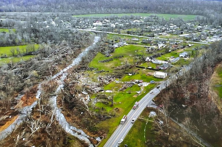 Justin Gibbs, a meteorologist with the National Weather Service (NWS) based in Kentucky, told The Associated Press the tornado travelled between 24-32km (15 to 20 miles) and remained on the ground for about 15 minutes.