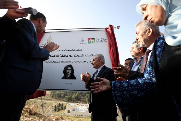 “We will continue to go after those killers, those criminals. We do not believe in the investigation committee that they announced, or its results. We want there to be an independent investigation,” Shtayyeh told Abu Akleh’s brother, Anton, as he unveiled the cornerstone.