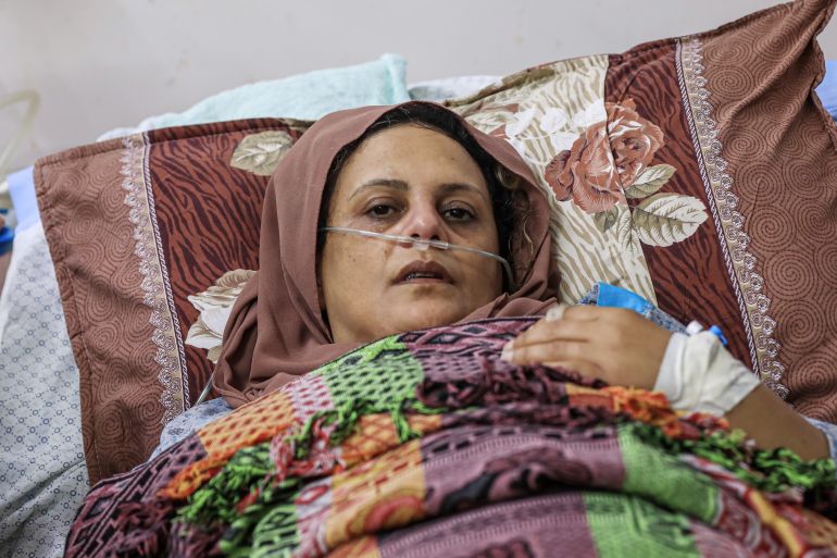 Gaza City – Najwa Abu Aisha, 48, is lying in a hospital bed, surrounded by family. She has been there since May 11 when Israel bombed empty farmland near her Gaza home, sending her hurtling from the second-floor rooftop of her house.