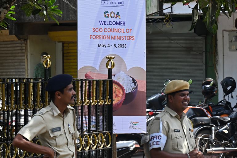 Police provide security outside the Shanghai Cooperation Organisation meeting in Goa on May 4, 2023 [Punit Paranjpe/AFP]