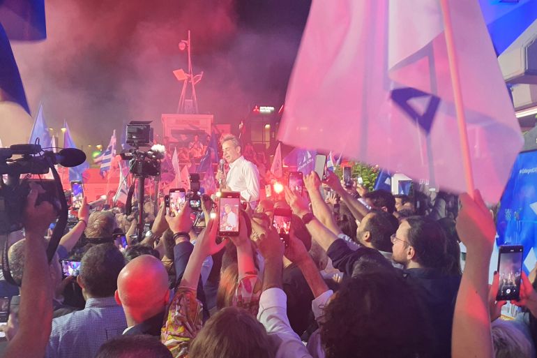 Athens, Greece – Jubilant supporters clamoured around New Democracy’s headquarters, floodlit in the party’s trademark blue, to celebrate Prime Minister-elect Kyriakos Mitsotakis’s return for a second term.