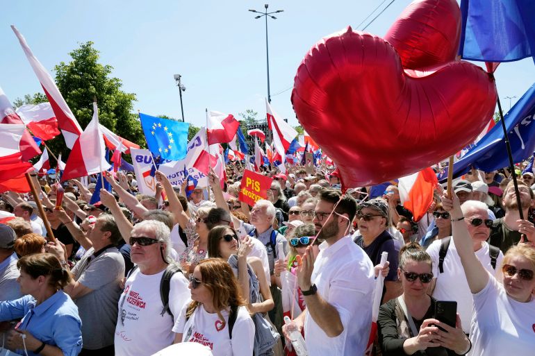 Hundreds of thousands of protesters gathered in Poland on the 34th anniversary of the eastern European country’s first post-war democratic election – a march the liberal opposition billed as a test of its ability to end nearly eight years of nationalist rule later this year.