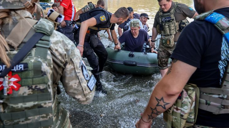 Ukraine’s defence ministry shared a video on Twitter of what appears to be rescue workers using drones to drop supplies to people trapped by flooding.
