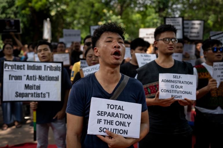 Nearly 400 men and women also held a protest in the Indian capital, New Delhi, with similar demands. They carried placards reading “We demand action against the perpetrators” and “Resign, Biren Singh”.