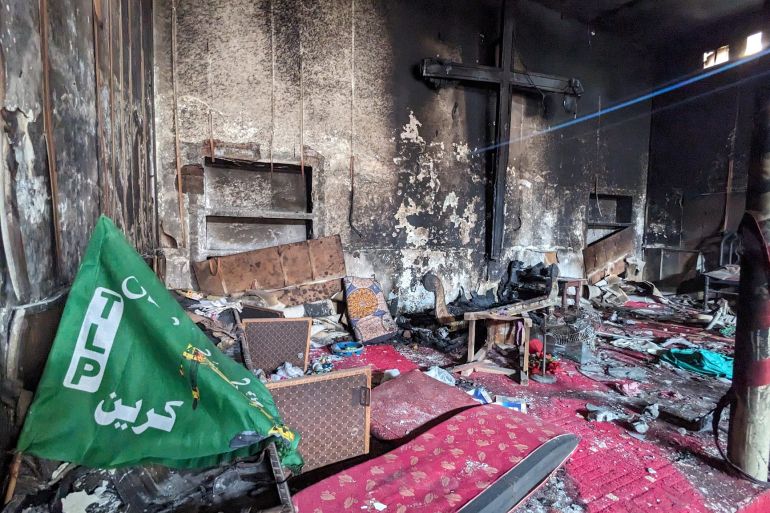 The men were chanting slogans that are associated with Tehreek-e-Labbaik Pakistan (TLP), a far-right party. In multiple videos, they can be seen clambering up the roof of the church, destroying the cross and setting the building on fire.