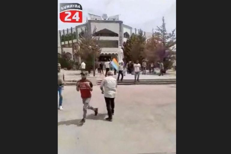 On Wednesday, a video posted online by the Sweida24 activist collective showed men running away from the entrance of a building in Sweida as about two dozen gunshots were heard.