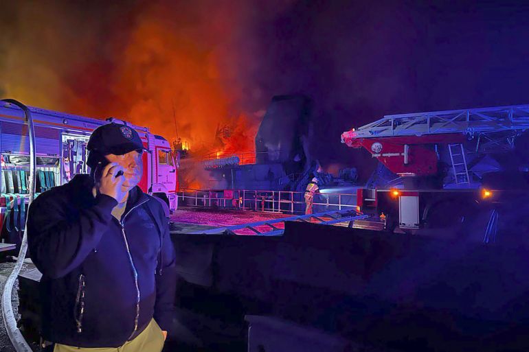 Ukraine claims responsibility for attack leading to a huge fire and leaving at least one Russian serviceman missing.
