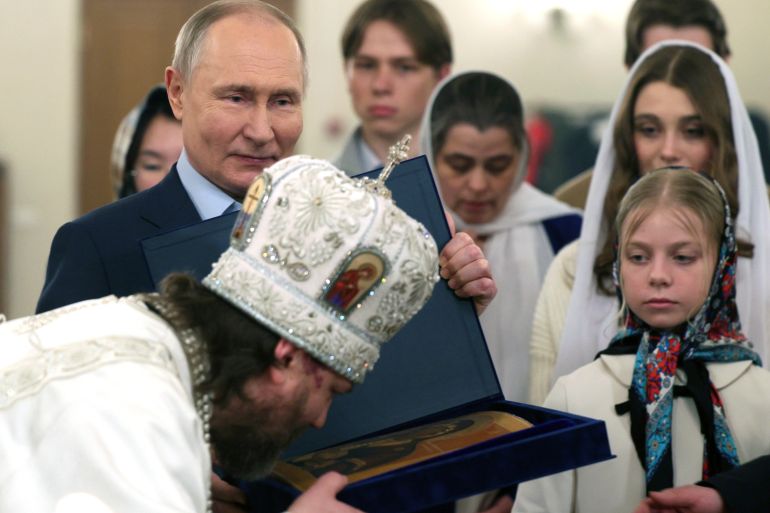 Facing a presidential election in March, Putin has sought to further extol “traditional values”. The Orthodox Church has long been a reliable pillar of his regime and has helped stoke support for the invasion of Russia’s neighbour.