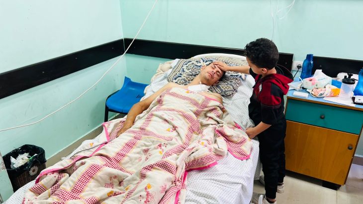 Doctors at the Public Aid Hospital in Gaza City said they were unable to treat him and prevent complete paralysis, adding that he suffers from damage to his arteries, veins and shattered bones.