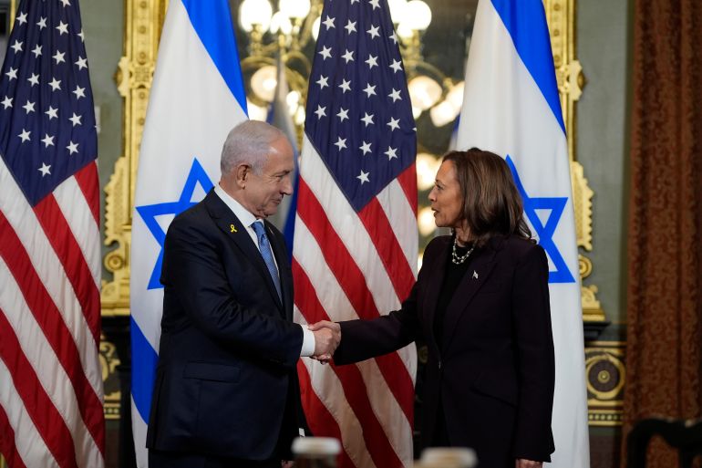![Vice President Kamala Harris, right, shakes hands with Israeli Prime Minister Benjamin Netanyahu on July 25 [Julia Nikhinson/AP Photo]](https://www.aljazeera.com/wp-content/uploads/2024/10/AP24207771944651-1729658700.jpg?resize=770%2C513&quality=80)