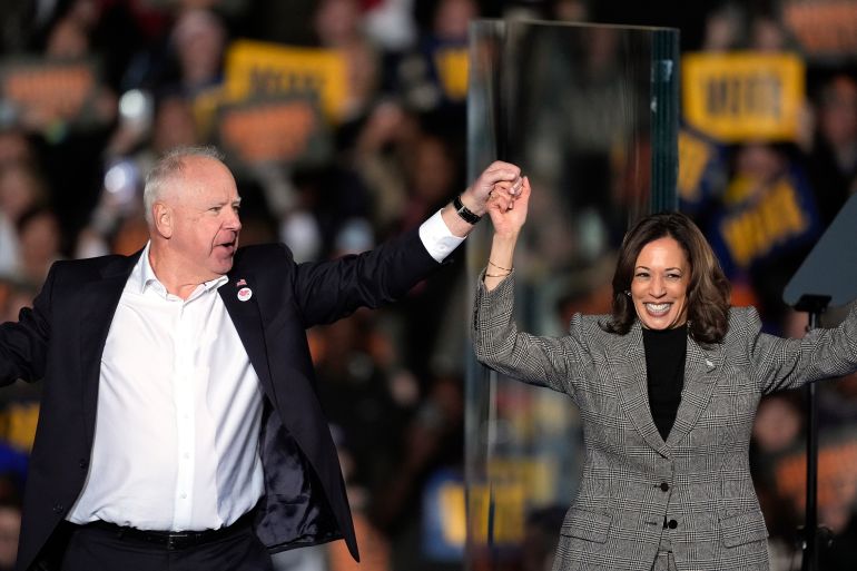 Democratic candidate appears with running mate Tim Walz, singer Maggie Rogers at rally in key swing state of Michigan.