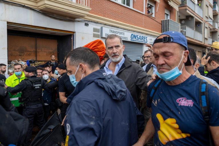Hundreds of residents of a Valencia suburb badly hit by last week’s deadly floods have protested during a visit by Spanish King Felipe, Queen Letizia, and Prime Minister Pedro Sanchez, with some demonstrators throwing mud at them.