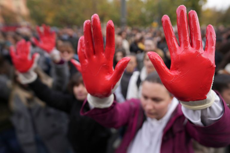 Protesters with red paint on their hands, symbolising blood, demanded arrests after a canopy collapsed at a railway station in Novi Sad, killing 15 people [File: Darko Vojinovic/AP]