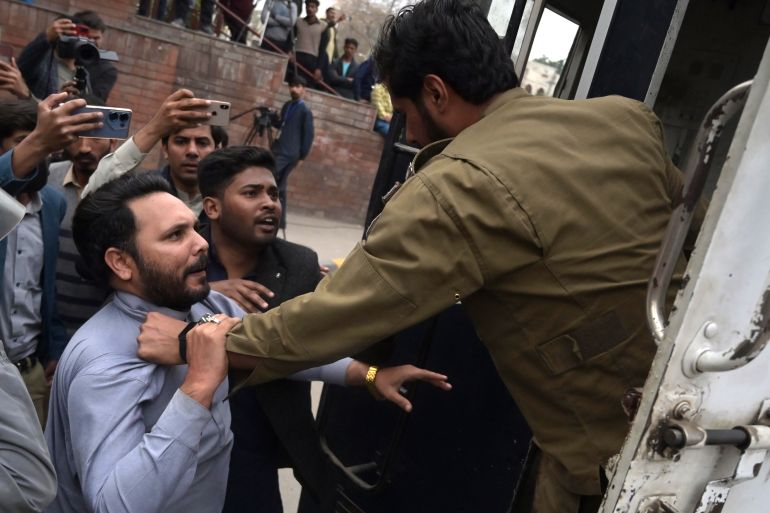 One video showed a bearded man holding a PTI flag being dragged out of his car. A large crowd gathered around his vehicle forcing the police to let the man go. Another video showed a PTI leader being pulled inside a police vehicle as he continued to raise slogans.