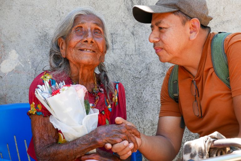 Oaxaca, Mexico – Outside Mama Cointa’s home where she has lived for almost all her life, guests have gathered to celebrate her 101st birthday. Her friend Victor steadies her quivering hand with his own while she tilts a ribbon-wrapped bouquet of wilting flowers to her nose. Her son Don Amado ushers visitors inside their family home.